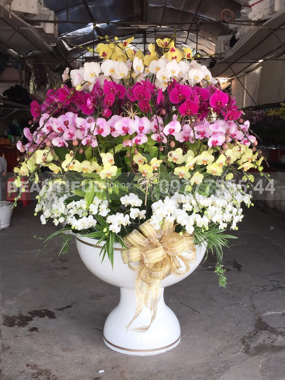 (Chậu hoa lan hồ điệp 150 cành có thiết kế đặc biệt chia hoa theo từng tầng, mỗi tầng hoa là một màu sắc khác nhau mang đến sự mới mẽ và thu hút mọi ánh nhìn. Sản phẩm rất phù hợp chưng ở sảnh cưới, nhà hàng, khách sạn, nơi tổ chức sự kiện, hoặc làm quà biếu tặng sếp, lãnh đạo vào những dịp tết đến)