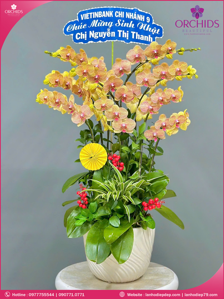 • Về cây hoa: Một chậu hoa lan hồ điệp đẹp và hoàn chỉnh sẽ được phối ghép từ nhiều cây hoa và tạo dáng hoàn toàn thủ công nên có thể sẽ khác nhau đôi chút giữa sản phẩm thực tế và trên hình. Cây hoa lan còn phụ thuộc theo mùa và điều kiện khách quan, tùy vào thời điểm hoa nở nhiều, nở ít khi shop có sẵn nên sẽ thay đổi về độ dầy hoa, thưa hoa và cách trang trí.
