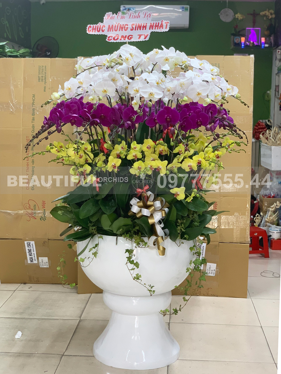 (Chậu hoa lan được decor từ 50 cành lan hồ điệp có màu sắc tươi mới, sang trọng. Rất phù hợp để làm quà tặng sếp, lãnh đạo hoặc chúc mừng khai trương, khánh thành)